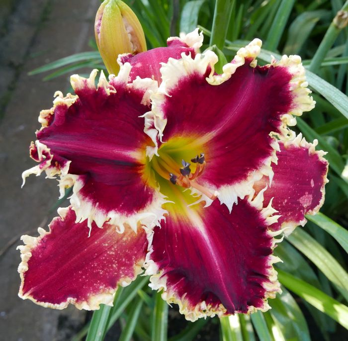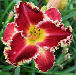 (Gossard 2007) TET 81/15 DOR, burgunder-maron-rot, Rand weiss + Zähne, 4*, 18 Bl., Duft, ((Order or Chaos × Shinto Etching) × (Forestlake Ragamuffin × Heavenly Beginnings)) 43 Kinder |