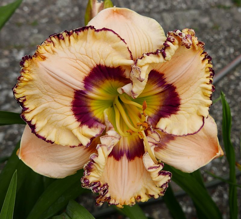 (Kaiser 2013) TET 66/15 SEV, purpur, Auge + rand blau, Schlund gelb-grün, 3*, 16 Bl., ((Kathy Chenet x portofino) x Magnificent Obscession) |