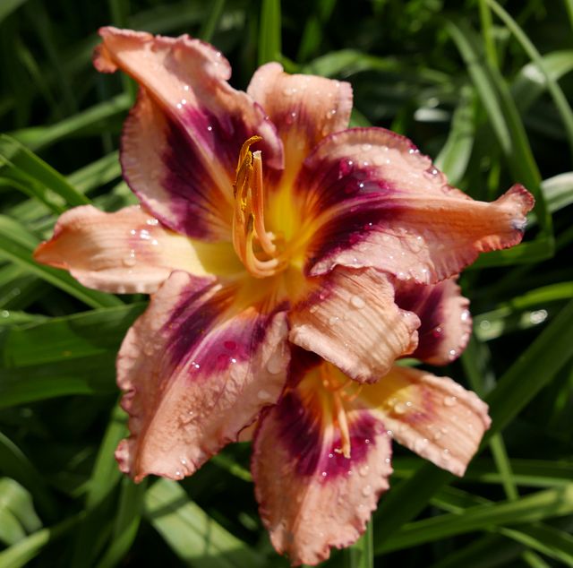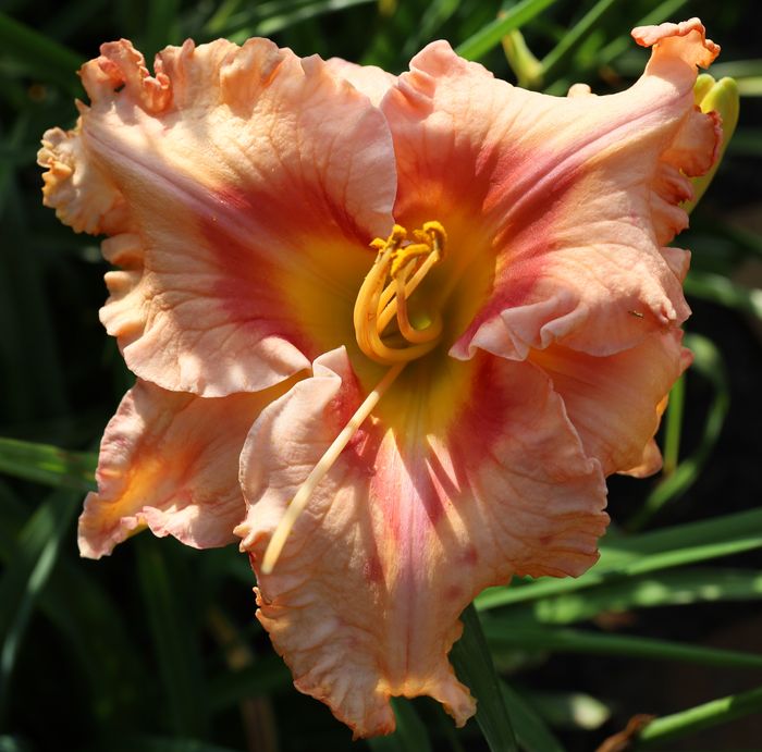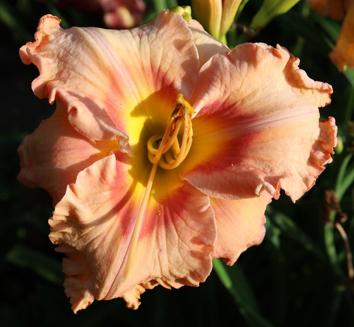 (Krismer 2019) TET 75/11 EV, pfirsich-rosa, Auge + Rand rot-pink, gelber Zahnrand, 2*, 15 Bl., (Flight of the Raven x How Beautiful Heaven Must Be) |