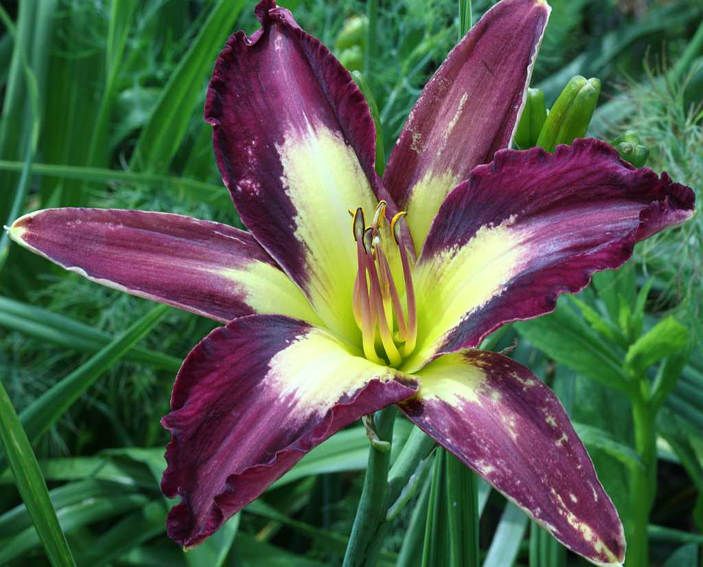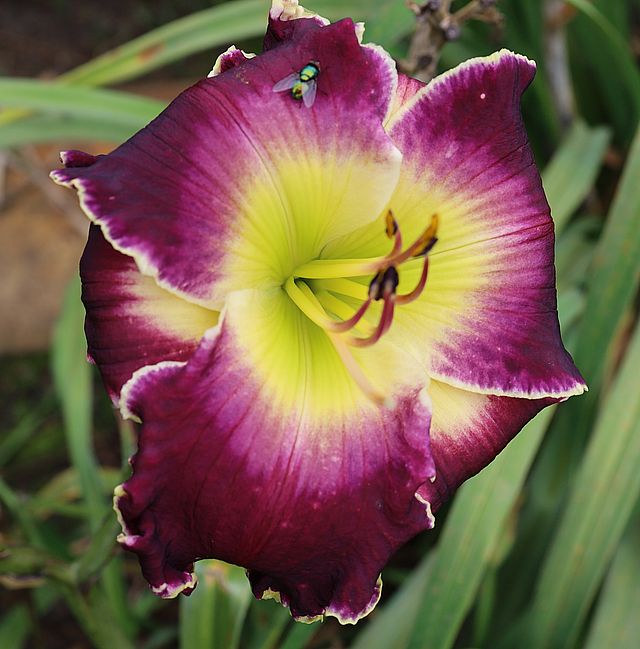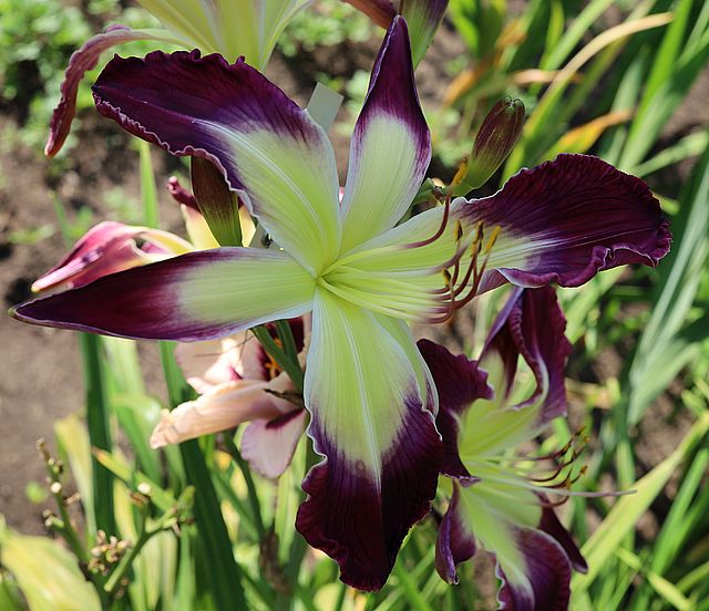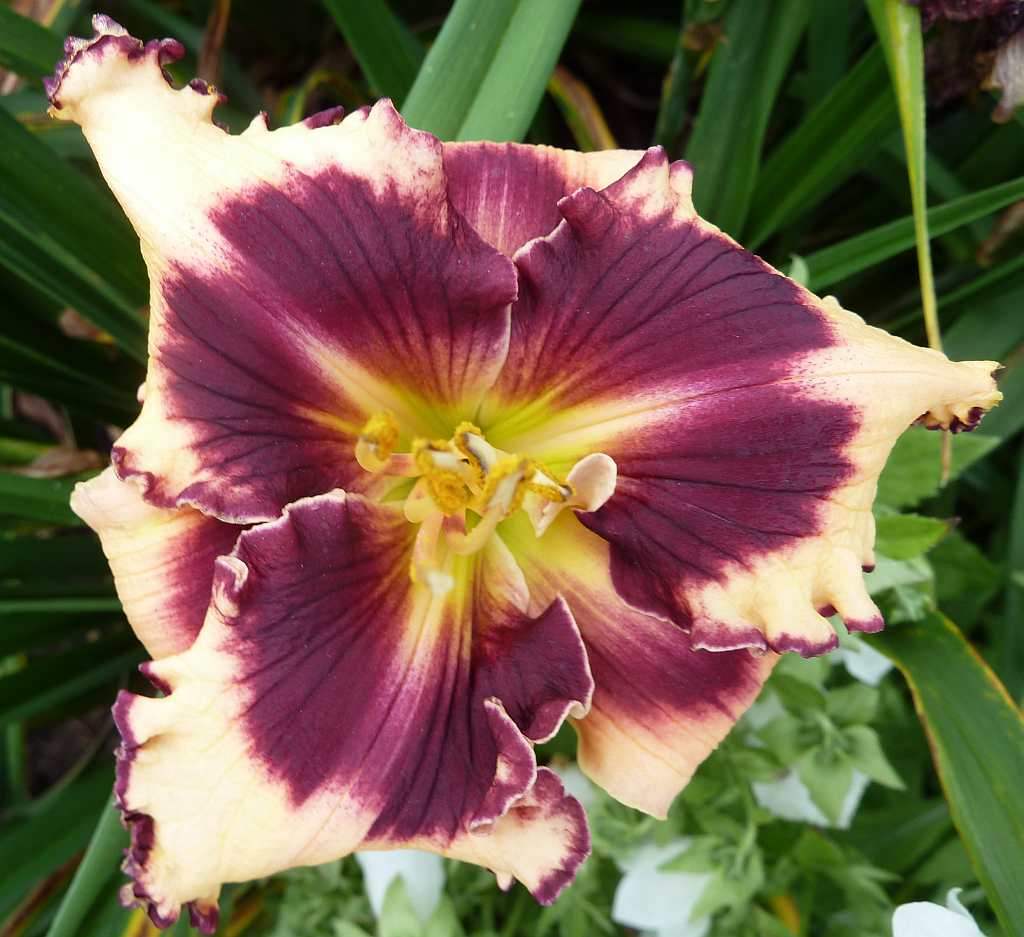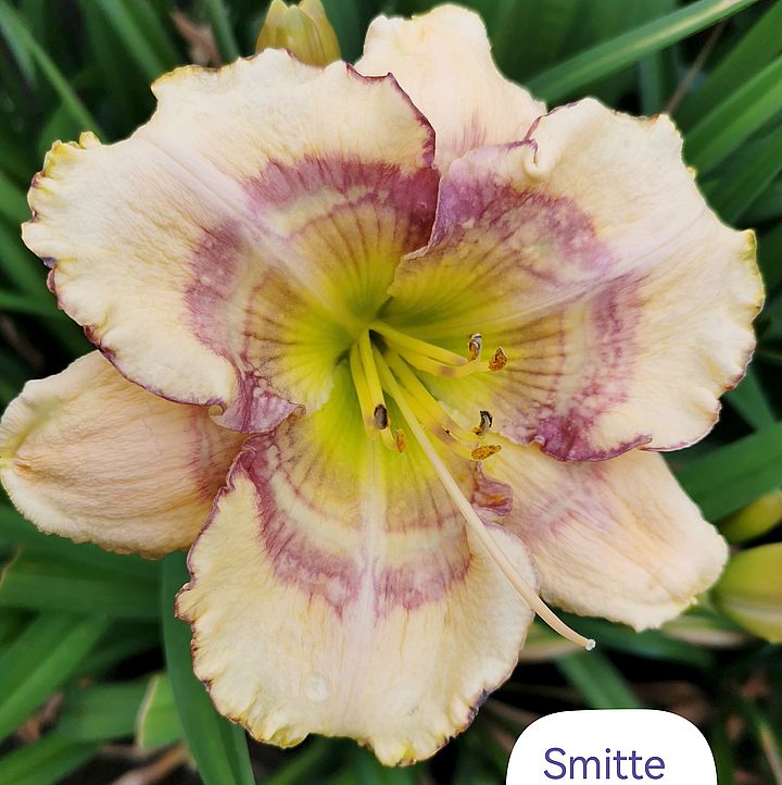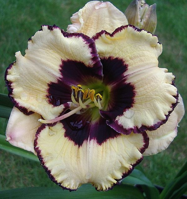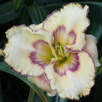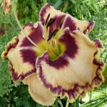 (Kinnebrew 2005) TET 65/15 SEV, creme, Auge patternet-purple, Rand purple, Schlund grün, 3*, 25 Bl., (Gerda Brooker x Spacecoast Dragon Prince) 5 Kinder |